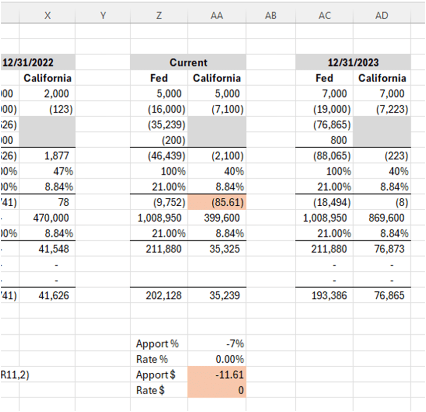 Let’s pretend that in 2022 we had a pre tax, pre apportioned $1 million loss for CA. Those three calculations from above would look as follows: