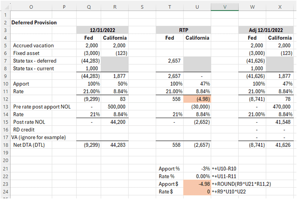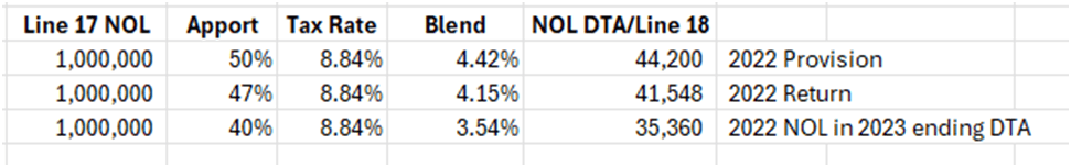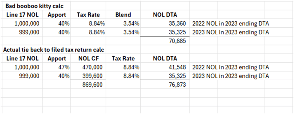 Note the third calculation makes no sense. We expected a 50% provision, and we filed a 47% return. That’s it. We would not adjust the 2022 NOL any further (like we would for say vacation accrual DTA) down to the 2023 apportionment because it is recorded POST apportionment and locked down.