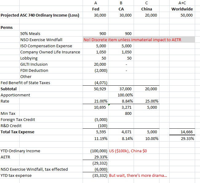 If your permanent adjustments figures come from Plan, you may likely need to continue the same analysis of Actual to Plan from above for each jurisdiction as well. (When I worked insurance, we had some HEAVY projections coming from Plan for investments that required extensive Plan to Actual, as well as some crazy 162(m)/PSU/RSU/Option scenarios that were head scratchers/day drinking inducing nightmares.) But we’ll keep it simple. Below we combined all our by-jurisdiction projections of taxable income. Assume that YTD Ordinary Income is the ($100,000) and that China subsidiary YTD is $0.