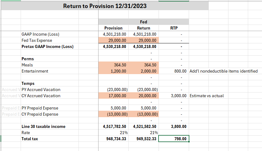 1. Figure out total adjustments. Take the prior year current provision in its entirety and compare to the filed tax return. Here’s a nice short example of what that would look like. I generally do this when I prepare the tax return (so RTP is being knocked out at the same time as tax return prep). Do reviewer a favor, add comments on what created the difference.
