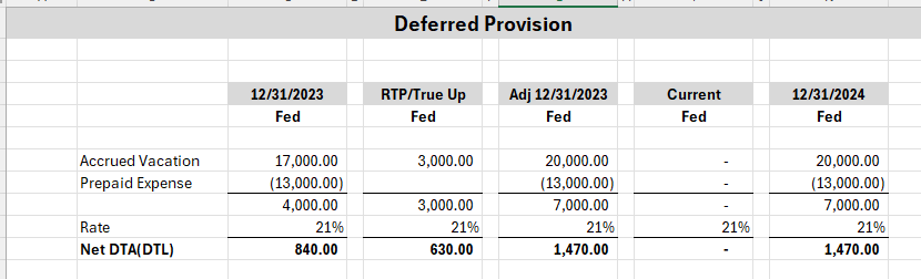 2. Update any temporary items to your Deferred Provision. For our accrued vacation, we want to adjust that 2023 ending balance from 17,000 to 20,000. Note this gives us a deferred tax expense effect of $630 (debit DTA, credit deferred tax expense). Do this same adjustment for all temporary items. Place total on the TARF, RTP Deferred Provision line (see below).