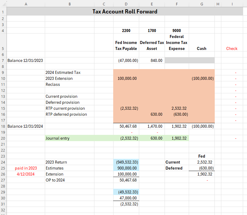 Throw down a reconciliation (I like to do this on TARF) of what the overpayment to the 2024 tax return should be. From this amount, figure out what should have been booked as the tax payable/receivable at 12/31/2023, which is the blue amount of 49,532, and 2,532 difference from the 47,000 actually recorded. (The 100k of extension payment wasn’t paid until 2024, see where we include on row 10).