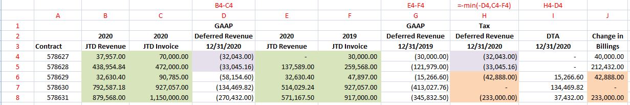 Column J is not needed, but it helps you to understand what is happening. When the change in billing is less than the GAAP Deferred Revenue, this means that what is deferred for tax cannot be less than what JTD is actual recognized as earned for GAAP. Note the purple items in Tax Deferred Revenue matches the GAAP Deferred Revenue. You have no DTA/DTL, no difference book to tax.